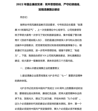 2022年国企廉政党课:筑牢思想防线,严守纪律底线,加强清廉国企建设同志们:按照全市党风廉政宣教月活动要求,今年的活动主题是“创清廉XX树清风正气”。上一次党委理论中心组学习,公司党委领导班子带领大家再一次学习了党纪和国家监察法,集中观看了警示教育片《贪欲不遏自毁人生》,目的是通过持续深入学习和从违纪违法案件中汲取教训,把党章党规党纪和各项规章制度厚植于心,绷紧遵纪守法这根弦,进一步筑牢思想防线,增强干部职工“免疫力”。下面,我就结合抓好XX公司党风廉政建设,深化清廉国企建设,给大家讲一堂廉政党课,具体来说有三个方面内容。一、正确认识建设清廉企业的重要意义1.建设清廉企业是贯彻落实习近平总书记...