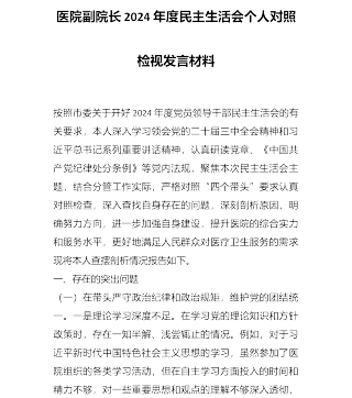 市人大分管民族华侨外事委员会副主任关于2024年度民主生活会个人对照检视材料(4+1)按照党中央和省委、市委关于开好2024年度党员领导干部民主生活会的要求,我紧紧围绕这次民主生活会主题重温党章党规,认真研读《中国共产党纪律处分条例》《中共中央办公厅关于推进党纪学习教育常态化长效化的意见》等重要文件,深入学习习近平新时代中国特色社会主义思想和党的二十届三中全会精神,严格按照“四个带头”要求,广泛听取班子成员、基层党组织、党员干部群众、人大代表的意见建议,紧密结合分管工作实际,深入查找自身存在的差距和不足,深刻剖析了问题根源,逐一明确整改举措。现将个人对照情况汇报如下。一、存在的突出问题(一)在...
