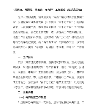 “周调度、月通报、季推进、年考评”工作制度(征求意见稿)为深入贯彻省委、省政府实施“百县千镇万村高质量发展工程”促进城乡区域协调发展(以下简称“百千万工程”)的部署要求,认真落实市委、市政府全面推进“百千万工程”工作部署全面落实县委、县政府工作安排,进一步提高工作效率和质量,增强工作计划性和科学性,切实推动“百千万工程”各项重点任务有力有序有效落实,县“百千万工程”指挥部办公室(以下简称县指挥办)实施“周调度、月通报、季推进、年考评”工作制度。一、工作目标按照“具体进度精准掌握、重要情况及时报告、重点问题有效解决、现场推进引领提升”的工作要求,通过“周调度、月通报、季推进、年考评”工作推进机制...