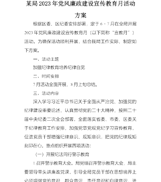 某局2023年党风廉政建设宣传教育月活动方案根据区委、区纪委安排部署,定于6-7月在全局开展2023年党风廉政建设宣传教育月(以下简称“宣教月”)活动。为确保活动顺利开展,结合我局工作实际,制定如下方案。一、活动主题加强纪律教育培养纪律自觉二、时间安排7月活动全面开展,8月上旬总结。三、活动内容深入学习习近平总书记关于全面从严治党、加强党的纪律建设重要论述,认真贯彻党的二十大精神,按照二十届中央纪委二次全会部署,全面落实省委、市委、区委关于纪律教育工作安排,加强党章党规党纪学习宣传教育,促进党员干部增强纪律意识、规矩意识,把党的纪律规矩刻印在心。重点组织开展四项活动:(一)开展纪法同行警示教育...