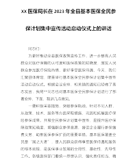 XX医保局长在2023年全县基本医保全民参保计划集中宣传活动启动仪式上的讲话 同志们: 为更好推动全县医保政策宣传工作,进一步提高人民群众对医疗保障的认可度和医保政策的知晓度,激发人民群众参加医疗保险热情,更好享受医保待遇,今天,我们汇聚县体育馆,隆重举行基本医保全民参保计划集中宣传活动启动仪式。根据会议安排,相关镇的通知已经做了表态发言,我局**同志也对基本医保全民参保计划进行了部署安排,下面,我讲几点意见。 一要积极采取措施,突破参保瓶颈。针对不同人群,从政策、技术、服务等方面采取措施,巩固和拓展医疗保险参保成果。开展全民参保计划集中宣传,是提升医疗保障政策知晓度、增强群众参保意愿、...