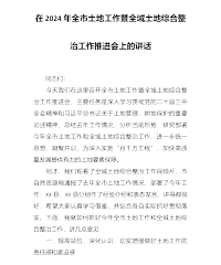 在2024年全市土地工作暨全域土地综合整治工作推进会上的讲话 同志们: 今天我们在这里召开全市土地工作暨全域土地综合整治工作推进会,主要任务是深入学习贯彻党的二十届三中全会精神和习近平总书记关于土地管理、耕地保护的重要论述精神,总结去年工作情况,分析当前形势,研究部署今年全市土地工作和全域土地综合整治工作,进一步统一思想、凝聚共识,为深入实施“百千万工程”、加快高质量发展提供有力的土地要素保障。 刚才,我们观看了全域土地综合整治工作视频片,市自然资源局通报了去年全市土地工作情况,部署了今年工作;XX县、XX县分别作了经验介绍和表态发言,讲得都很好,希望大家认真学习借鉴,并结合各自实际抓好...