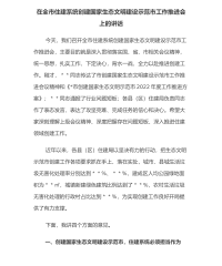 在全市住建系统创建国家生态文明建设示范市工作推进会上的讲话今天,我们召开全市住建系统创建国家生态文明建设示范市工作推进会,主要目的就是深入贯彻落实国、省、市相关会议精神,统一思想,扎实工作,下定决心,背水一战,全力以赴推进创建工作。刚才,**同志传达了市创建国家生态文明建设示范市工作推进会议精神和《*市创建国家生态文明示范市2022年度工作推进方案》;**同志通报了行业问题短板;各县(区)住建局负责同志作了表态发言,表达了攻坚克难、完成任务的信心和决心。希望大家深刻理解上级会议精神、深度把握存在问题短板、深入推进住建领域创建工作。近年以来,各县(区)住建局以坚决有力的行动,把生态文明示范市创建...