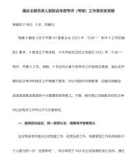 国企主要负责人就配合年度考评(考核)工作表态发言稿尊敬的X书记、X总,同事们:根据X集团《关于开展XX直管企业2021年“三合一”考评X工作的通知》要求,X团成立了考评组,今天开始正式对公司进行2021年“三合一”考评,开展X工作。刚刚,X书记向大家介绍考评工作的相关事宜,就扎实开展好此次考评和相关工作明确了要求,对公司提升内部管理,加强内部建设,促进高质量发展具有十分重要的指导意义。下面,我代表公司就配合好此次考评以及相关工作作以下几方面表态。一、提高政治站位,统一思想认识,明确考评重要意义这次考核考评是对公司党建工作、经营业务工作、制度管理工作和领导班子个人能力的一次“全面体检”,充分体现...