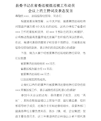 县委书记在省委第六巡视组巡视某县动员会议上的主持词及表态发言敬的省委组织部**常务副部长,尊敬的省委第六巡视组**组长**副组长,各位领导、同志们:根据省委的统一部署,省委第六巡视组今天进驻我县开展巡视工作,充分体现了省委对我县工作的关心与支持体现了对某县各级领导班子和领导干部的关怀和爱护。在此,我代表某县四套班子,对省委第六巡视组一行的到来表示热烈的欢迎和衷心的感谢! 首先,我向大家介绍参加巡视动员会议的各位领导: 省委组织部常务副部长、省委巡视工作领导小组成员** 省委第六巡视组组长** 省委第六巡视组副组长** 市委副书记、组织部部长、巡察工作“五人小组”成员** 市委常委、...