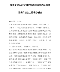 在市委第五巡察组巡察市城管执法局党组情况反馈会上的表态发言各位领导,同志们:本人坚决负起巡察整改第一责任人职责,坚持以身作则、以上率下,带头抓好巡察整改工作,带领全体干部职工,认真按照市委王胜书记听取巡察情况汇报时的讲话精神和整改要求,巡察组的反馈意见和要求,提高思想认识,正视存在问题,以高度的思想自觉、政治自觉、行动自觉采取坚决措施,不回避、不走样,不拖拉、不推诿,全力以赴抓好整改落实。一、提高政治站位,增强整改工作自觉性。我们要深刻认识巡察反馈意见的重要作用和重大意义,切实把思想和行动统一到市委对巡察整改工作的部署和要求上来,把落实巡察整改工作作为当前一项重要政治任务,增强政治责任感和政治...