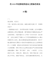 在2023年巡察动员会议上的表态发言(4篇)(一)各位领导,同志们:下面,我代表XX单位党组,就配合做好巡察工作,郑重表态如下:一是提高政治站位,坚决贯彻巡察工作部署。这次市委第X巡察组到XX单位开展巡察,是市委坚定不移推进全面从严治党的体现,也是市委对XX工作的一次全方位的“政治体检”,这充分体现了市委对XX工作的高度重视和对XX事业发展的关心支持。通过巡察组的监督检查和指导,有利于我们更好地学习贯彻习近平新时代中国特色社会主义思想和党的二十大精神,更加扎实有效地执行党中央和省市委的重大决策部署;有利于我们扎实贯彻全面从严治党和党风廉政建设要求,落实“两个责任”,深化“一岗双责”,大力弘扬学...