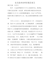 市长在市九届人大二次会议闭幕会上的讲话(当选市长的表态发言)尊敬的各位代表,同志们:刚才,大会选举我担任X市人民政府市长,深感使命光荣、责任重大。衷心感谢市人大常委会主任、各位副主任的悉心指导,衷心感谢各位代表的信任和重托!到X工作一个多月来,由衷感受到X历史悠久、源远流长,人杰地灵、文化璀璨,是一个底蕴厚重、开放包容、充满潜力的城市。深切感受到X人民民风淳朴、和谐包容、勤劳善良、热情好客;党员干部勇于创新、富于创造、务实重干;产业特色鲜明、集群优势凸显、发展势头强劲,是一个厚德载物、充满希望的宝地。能为这座城市的发展和全市人民福祉贡献自己的绵薄之力,深感荣幸、倍感自豪。同时,也清醒认识到,X...