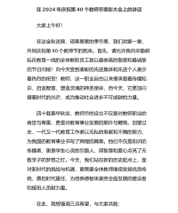 县职教中心校长在庆祝第40个教师节暨教育教学工作表彰大会上的讲话尊敬的各位领导,老师们、同学们:大家下午好!云天收夏色,木叶动秋声。带着暑假生活的美好记忆,怀着新学年的无限憧憬,我们又一次欢聚在美丽、亲切的校园,隆重举行“聚力启航新征程扬帆奋进向未来”主题教育活动,旨在庆祝第40个教师节并表彰、激励上学期在教育教学工作中做出优异成绩的教职员工。借此,我代表学校对童心飞扬、青春激扬、斗志昂扬的630余名新同学表示热烈的欢迎!向志存高远、勤学苦练、积极进取的全体同学表示美好的祝愿!向勤于耕耘、乐于奉献、勇于创新的全体教职员工表示最诚挚的节日祝福!向县、局领导对职教中心的支持厚爱表示最衷心的感谢!守...