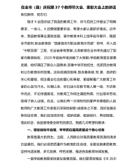 在全市(县)庆祝第37个教师节大会、表彰大会上的讲话各位教师、同志们:刚才X全面总结了我县的教育工作,对今后的工作提出了明确要求,一会儿,X还要做重要讲话,希望大家认真抓好落实。近年来,我县教育事业蓬勃发展,高中教育本科上线率连年攀升,稳居全市前列;职业教育获“国家级农村职业教育示范县”称号,并入选“中职双高”工程,在全省享有赞誉;义务教育在全市率先通过了国家均衡县验收,2020年起始年级消除了大班额;学前教育普及普惠发展,较好满足了群众入园需求;苏豫中学开始招生,优质民办教育和公办教育协同发展。这些成绩的取得,饱含着各级.党.委、政府的关心和重视,倾注着全社会的爱心和奉献,更凝聚着广大教育工...