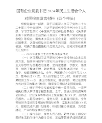 国有企业党委书记2024年民主生活会个人对照检查发言材料(四个带头)根据党委统一部署,我于近期深入学习了党的二十大、二十届三中全会精神、习近平新时代中国特色社会主义思想,学习了党章和《中国共产党纪律处分条例》《关于新形势下党内政治生活的若干准则》《中国共产党党内监督条例》等规定。聚焦本次民主生活会主题,对照五个方面问题要求,认真检视反思自身存在的问题,深刻剖析思想根源,明确了整改措施和今后努力方向。现将对照检查情况汇报如下:一、2023年度民主生活会整改落实情况(一)学习贯彻习近平新时代中中国特色社会主义思想方面。始终坚持把学习贯彻习近平新时代中国特色社会主义思想作为首要政治任务,坚持读原著、...