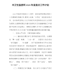 市卫生监督所2024年度重点工作计划 2024年是新中国成立75周年,是全面贯彻落实党的二十大精神的关键之年,是深入实施“十四五”规划的攻坚之年。全所始终坚持以习近平新时代中国特色社会主义思想为指导,认真贯彻落实市委市政府和市卫生健康局的工作部署,牢固树立宗旨意识、厚植为民情怀,在守护人民健康征程中恪尽职守,为XX打造广东高质量发展新增长极贡献力量。 一、全面从严治党,不断加强政治建设 (一)强化政治理论学习,坚持党的政治引领。认真落实“第一议题”制度、“三会一课”、主题党日活动,结合“学习强国”、“XX党建”、共产党员网等学习平台,形成党员领导干部率先学、各支部跟进学、普通党员认真学的...
