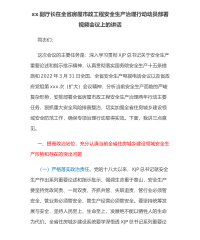 xx副厅长在全省房屋市政工程安全生产治理行动动员部署视频会议上的讲话同志们:这次会议的主要任务是:深入学习贯彻习近平总书记关于安全生产重要论述和指示批示精神,认真贯彻落实国务院安全生产十五条措施和2022年3月31日全国、全省安全生产电视电话会议以及省政府党组第xxx次(扩大)会议精神,分析当前安全生产面临的严峻复杂形势,安排部署全省房屋市政工程安全生产治理两年行动主要任务,狠抓重大安全风险排查整治,切实加强全省住房城乡建设领域安全防范工作,确保专项治理行动取得实效。下面,我讲三点意见。一、提高政治站位,充分认清当前全省住房城乡建设领域安全生产形势和存在的突出问题(一)严格落实政治责任。党的十...