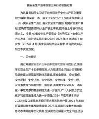 镇安全生产治本攻坚三年行动实施方案为认真贯彻落实习近平总书记关于安全生产系列重要指示精神,落实省、市、县关于安全生产工作的决策部署,进一步压实安全生产责任,强化安全生产措施,夯实安全生产基础,坚决防范遏制重特大生产安全事故,推动安全守底行动走深走实。根据xx省安全生产委员会《关于印发〈安全生产治本攻坚三年行动实施方案(2024-2026年)〉的通知》(x安发〔2024〕4号)要求及县相关会议要求,结合我镇实际,制定本实施方案。一、总体要求通过开展安全生产三年治本攻坚和安全守底行动,落细落实安全生产十五条硬措施,大力推进安全风险分级管控和隐患排查治理双重预防体系建设,在安全理念、安全责任、安全规...