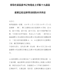 领导在某县委书记专题会上听取十九届县委第五轮巡察情况时的点评讲话同志们:按照县委统一部署,202X年11月23日至202X年1月6日,县委第一、第二、第三巡察组分别对县政务XX党组、县XX组、县XX党组、县XX组、县XX总支、县XX党组开展了巡察。今天我们召开专题会,有这么几个议程:一是听取XX届县委第XX轮巡察综合情况及第XX轮巡察反馈问题整改情况;二是分别听取县委第XX、XX、XX巡察组本次巡察情况汇报;最后我再强调几点意见。下面依次进行,首先进行第一项议程:请XX同志汇报XX届县委第XX轮巡察综合情况以及第XX轮巡察反馈问题整改情况。......XX届县委第XX轮巡察完成了XX家县直单位...