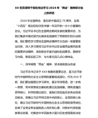 XX党员领导干部在传达学习2024年“两会”精神研讨会上的讲话2024年全国两会,是在新中国成立75周年、实现“十四五”规划目标任务关键一年召开的一次十分重要的会议。习近平总书记在全国两会期间发表的重要讲话,为我们推进中国式现代化具体实践提供了思想指引和行动指南。我们要把学习贯彻全国两会精神作为当前一项重要政治任务,深入学习贯彻习近平总书记在全国两会期间发表的重要讲话精神,深刻领会丰富内涵和实践要求。围绕学习内容,联系实际工作,与大家交流几点心得体会。一、深学细悟“两会”精神,坚决做到政治忠诚习近平总书记关于XXX制度的重要论述,是习近平新时代中国特色社会主义思想的重要组成部分。作为XXX干部...