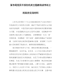 某市局党员干部在机关主题教育读书班上的发言交流材料 A总书记在党的二十大上全面回顾总结了过去五年的工作和新时代十年的伟大变革,阐述了开辟马克思主义中国化时代新境界、中国式现代化的中国特色和本质要求等重大问题,对全面建设社会主义现代化国家、全面推进中华民族伟大复兴进行了战略谋划,对统筹推进“五位一体”总体布局、协调推进“四个全面”战略布局做出了全面部署,为新时代新征程党和国家事业发展、实现第二个百年奋斗目标指明了前进方向,具有特别的里程碑意义。 我仔细聆听和学习下来,感到非常的激动和自豪。一是艰难困苦,玉汝于成。五年来,以A同志为核心的党中央带领全党全军全国各族人民有效应对严峻复杂的国际形势...