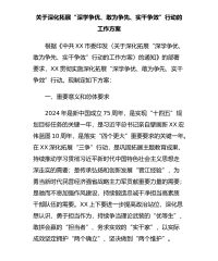 关于深化拓展“深学争优、敢为争先、实干争效”行动的工作方案根据《中共XX市委印发〈关于深化拓展“深学争优、敢为争先、实干争效”行动的工作方案〉的通知》的部署要求,XX贯彻实施深化拓展“深学争优、敢为争先、实干争效”行动。现制定如下方案:一、重要意义和总体要求2024年是新中国成立75周年,是实现“十四五”规划目标任务的关键一年,是习近平总书记亲自擘画新XX宏伟蓝图10周年,是落实“四个更大”重要要求的关键一年。在XX深化拓展“三争”行动,是巩固拓展主题教育成果,持续推动学习贯彻习近平新时代中国特色社会主义思想走深走实的需要;是传承弘扬和创新发展“晋江经验”,为勇当新时代民营经济强省战略主力军贡...