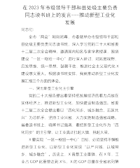 在2023年市级领导干部和县处级主要负责同志读书班上的发言---推动新型工业化发展同志们:全市“两会”刚刚闭幕,市委就举办市级领导干部和县处级主要负责同志读书班,深入学习党的二十大和省委十二届二次全会精神,邀请国内知名专家学者授课,围绕建设“一区一枢纽一中心”进行深入研讨,对拓宽视野、启发思维、统一思想、鼓舞干劲,推进社会主义现代化X建设意义重大。根据读书班安排,我就推动新型工业化发展汇报三个方面的体会。一、突出新型工业化主引擎党的二十大报告提出要坚持把发展经济的着力点放在实体经济上,推进新型工业化,加快建设制造强国。省委十二届二次全会提出要以“四化同步、城乡融合、五区共兴”为总抓手,坚持工业...