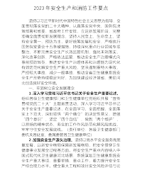 2023年安全生产和消防工作要点坚持以习近平新时代中国特色社会主义思想为指导,全面贯彻落实党的二十大精神,认真落实党中央、国务院决策部署和省委、省政府工作安排,立足新发展阶段,完整准确全面贯彻新发展理念,坚持人民至上、生命至上,坚持安全第一、预防为主,更好统筹发展和安全,严格执行国务院安委会十五条硬措施,持续深化重点行业领域专项整治,不断完善安全生产长效监管机制,强化末端落实,深化改革创新,严格依法监管,推动安全生产治理模式向事前预防转型,推进安全生产治理体系和治理能力现代化有效防范化解安全生产重大风险,坚决遏制重特大事故,严控较大事故,减少一般事故,推动全省卫生健康系统安全生产形势持续稳定向...