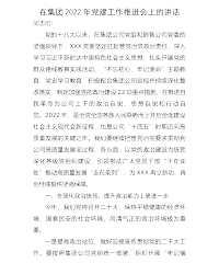 央企党委书记在2022年党建工作会上的总结讲话刚才,公司党群部门和司属各单位党组织,汇报了2021年工作总结,部署了2022年重点工作,相关安排与集团党委、公司党委的总体部署是一致的,与公司全年目标任务也是紧密衔接的。我相信大家的努力一定会给公司全年发展奠定良好的基础,在这里我代表公司党委对各位辛苦付出的党群同志表示感谢。总体来说各单位党群工作水平参差不齐,有些基层组织党群工作相对成熟,有些基层组织还有很大的改进空间。下去以后,希望各单位加强学习交流,持续改进工作方法、不断提升工作质效。2022年,是党的二十大召开之年,是“十四五”规划承前启后之年,也是“国企改革”三年行动的收官之年。做好今年...