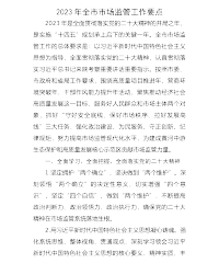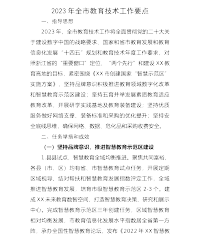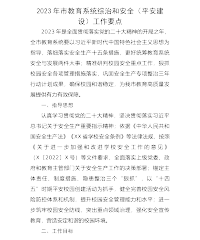 2023年市教育系统综治和安全(平安建设)工作要点2023年是全面贯彻落实党的二十大精神的开局之年,全市教育系统要以习近平新时代中国特色社会主义思想为指导,落细落实安全生产十五条措施,更好统筹教育系统安全与发展两件大事;精准研判校园安全重点工作,狠抓校园安全各项管理措施落实,巩固安全生产专项整治三年行动计划成果,确保校园和谐稳定,为我市教育高质量发展提供有力有效保障。一、指导思想认真学习贯彻党的二十大精神,坚决贯彻落实习近平总书记关于安全生产重要指示精神;依据《中华人民共和国安全生产法》《XX省学校安全条例》等法律法规,按照《关于进一步加强和改进学校安全工作的意见》(X〔2022〕X号)等文件...