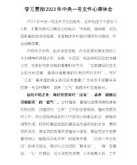 学习贯彻2023年中央一号文件心得体会2023年中央一号文件于近日发布,文件包括9个部分33条,主要内容可以概括为促振兴、守底线、强保障,对巩固拓展脱贫攻坚成果、全面推进乡村振兴指明方向路径、作出战略部署。开局关乎全局,起步决定成败,在全面贯彻落实党的二十大精神的开局之年、实施“十四五”规划承前启后的关键之年,在新时代新征程的重要时间节点,“全面建设社会主义现代化国家,最艰巨最繁重的任务仍然在农村”,守好“三农”基本盘的意义依旧至关重要,广大党员干部要牢牢把握一号文件精神,涵养“三气”助推乡村全面振兴。站在开局之年,用好党管农村“法宝”,涵养“敢教日月换新天”的“底气”。文件强调,要强化政策保...