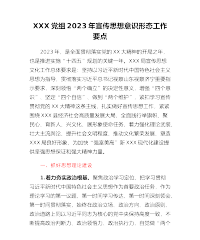XXX党组2023年宣传思想意识形态工作要点2023年,是全面贯彻落实党的XX大精神的开局之年,也是推进实施“十四五”规划的关键一年。XXX局宣传思想文化工作总体要求是:坚持以习近平新时代中国特色社会主义思想为指导,贯彻落实习近平总书记视察山东视察济宁重要指示要求,深刻领悟“两个确立”的决定性意义,增强“四个意识”、坚定“四个自信”、做到“两个维护”,紧扣学习宣传贯彻党的XX大精神这条主线,扎实做好宣传思想工作,紧紧围绕XXX县经济社会高质量发展大局,全面践行举旗帜、聚民心、育新人、兴文化、展形象使命任务,着力强化理论武装、壮大主流舆论、提升社会文明程度、推动文化繁荣发展、塑造XXX局良好形象...