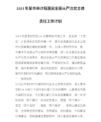 2023年某市审计局落实全面从严治党主体责任工作计划2023年是贯彻党的XX大精神的开局之年,是实施“十四五”计划承前启后的关键一年,是为全面建设社会主义现代化国家奠定基础的重要一年。为深入贯彻党中央、省、市委关于全面从严治党的决策部署,进一步压紧压实全面从严治党主体责任,推动全面从严治党各项工作落实落地我局紧紧围绕改革发展大局,严肃党内生活,强化教育监管,强化制度约束,强化风险防控,强化监督执纪问责,锲而不舍抓好作风建设,努力取得全面从严治党新成效。一、指导思想以习近平新时代中国特色社会主义思想为指导,深入贯彻党的XX大和二十届中央纪委二次全会精神,认真落实市委九届四次全会、市纪委九届三次全...