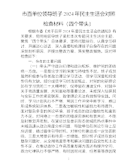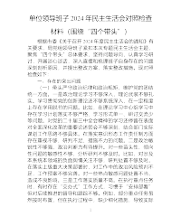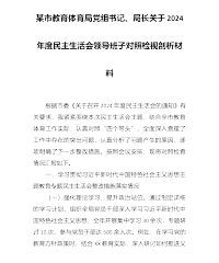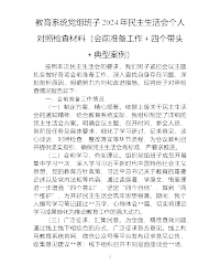 教育系统党组班子2024年民主生活会个人对照检查材料(会前准备工作+四个带头+典型案例)按照本次民主生活会的要求,我们班子紧扣会议主题,扎实做好各项会前准备工作,深入查找自身存在问题,深刻剖析原因,明确努力方向和改进措施。现将班子对照检查情况报告如下:一、会前准备工作情况(一)制定方案,精心部署。依据上级关于民主生活会的通知精神,结合教育系统实际,我组织制定了详细的民主生活会方案。明确会议主题、召开时间、参会人员、各阶段任务及具体要求,细化了学习研讨、征求意见、谈心谈话、对照检查、整改落实等环节流程,为会议顺利召开提供坚实指引,确保民主生活会高标准、严要求推进。(二)会前学习,夯实理论。组织党...
