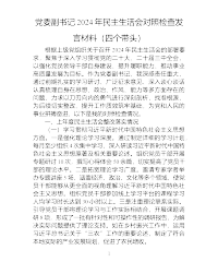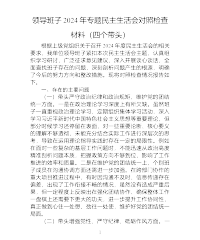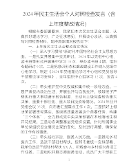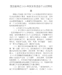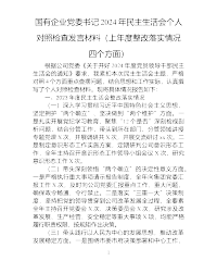 国有企业党委书记2024年民主生活会个人对照检查发言材料(上年度整改落实情况四个方面)根据公司党委《关于开好2024年度党员领导干部民主生活会的通知》要求,我紧扣本次民主生活会主题,严格对照4个方面重点查摆问题,结合思想和工作实际,认真撰写了个人对照检查材料。现将具体情况报告如下:一、2023年度民主生活会整改落实情况(一)深入学习贯彻习近平中国特色社会主义思想,坚定拥护“两个确立”、坚决做到“两个维护”方面。一是扎实开展党纪学习教育,聚焦“12个是否”深刻检视剖析问题,结合分管工作,带头到所在部门、分管领域讲授专题党课X次,开展调研共X次,开展交流研讨xx次。二是制定意识形态工作实施方案,定...