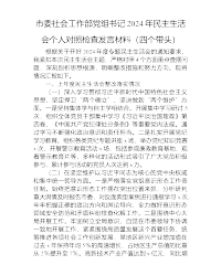 市委社会工作部党组书记2024年民主生活会个人对照检查发言材料(四个带头)根据关于开好2024年度专题民主生活会的通知要求,我紧扣本次民主生活会主题,严格对照4个方面重点查摆问题,深刻剖析思想根源,明确整改措施和努力方向。现将情况汇报如下。一、上年度民主生活会整改落实情况(一)深入学习贯彻习近平新时代中国特色社会主义思想,坚定捍卫“两个确立”、坚决做到“两个维护”方面。一是坚持集体学与自主学相结合。开展集中学习研讨5次,组织全体党员干部集中学习《习近平谈治国理政》第四卷、《中国共产党纪律处分条例》等重要党内法规。通过学习不断强化政治意识和责任担当。二是扎实开展党纪学习教育。组织各类党纪专题讲座...