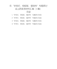 在“学党纪、明规矩、强党性”专题研讨会上的发言材料汇编(4篇)目录1.“学党纪、明规矩、强党性”专题研讨发言2.“学党纪、明规矩、强党性”专题研讨发言3.“学党纪、明规矩、强党性”专题研讨发言4.“学党纪、明规矩、强党性”专题研讨发言“学党纪、明规矩、强党性”专题研讨发言中央党的建设工作领导小组x月x日召开会议,研究部署党纪学习教育工作,中共中央办公厅印发《关于在全党开展党纪学习教育的通知》,xx书记在省委中心组党纪学习教育读书班开班式上专门对开展党纪学习教育提出了具体要求,省委办公厅印发《省党纪学习教育实施方案》,昨天上午,集团公司党委召开党纪学习教育开班会,方勤升书记就开展好此次学习教育,...