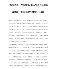 “践行宗旨,为民造福,树立和践行正确的政绩观”主题研讨交流材料(5篇)践行宗旨为民造福,是学习贯彻习近平新时代中国特色社会主义思想主题教育的一个重要目标。认真学习习近平总书记关于人民至上、坚持一切从人民利益出发的重要论述对于教育引导广大党员、干部特别是领导干部牢固树立群众观点,密切党同人民群众血肉联系,把惠民生、暖民心顺民意的工作做到群众心坎上,不断增强人民群众获得感幸福感、安全感,确保主题教育取得实实在在成效,具有极为重要的现实和指导意义。一是要做到心中有民。中国共产党坚持从中华优秀传统文化中汲取智慧,立足中国具体实际创造性地发展马克思主义,从成立之日起就把为中国人民谋幸福作为自己的初心使命...