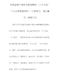 纪检监察干部队伍教育整顿“八个方面”个人对照检查材料---行使权力、清正廉洁、网络行为按照《关于开展纪检监察干部队伍教育整顿检视整治的工作方案》部署安排,我认真对照党中央“六个方面”“六个是否”,按照中央纪委《关于微信群发布涉政有害言论案件教训警示的通报》“五个必须”“五个坚决纠治”要求,结合前期自我检视、谈心谈话查摆的问题,重点从思想认识、理想信念、政治立场、坚守原则、严实作风、行使权力、清正廉洁、网络行为8个方面进行了对照检查。现将个人对照检查情况报告如下: 一、存在的主要问题 (一)在思想认识方面。教育整顿以来,我积极参加委机关组织的集中学习、交流研讨、主题党日和警示教育等活动,认真...