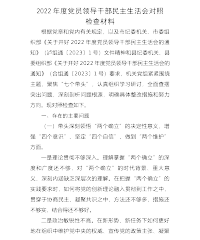 2022年度党员领导干部民主生活会个人检视剖析材料八个带头+上年度整改+学贯情况根据2022年度党员领导干部民主生活会通知要求,本人紧扣本次民主生活会的主题,紧紧围绕深入习近平新时代中国特色社会主义思想,学习贯彻党的二十大精神,坚持将个人自学和集体研讨相结合,与全局党员干部之间进行了深入的谈心谈话,进一步交流思想、交换意见,深入查找思想差距、理论短板、工作弱项,明确整改措施和今后努力方向。现将个人检视剖析情况如下:一、深入学习贯彻党的二十大精神情况10月16日上午,中国共产党第二十次全国代表大会在人民大会堂隆重开幕,习近平总书记代表第十九届中央委员会向大会报告。我全程认真观看了大会开幕式。会后...
