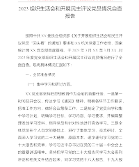 公文宝典(www.gongwenbaodian.com)收集整理,每天更新海量优质范文,让写材料变得简单!2023组织生活会和开展民主评议党员情况自查报告按照中共XX委员会组织部《关于开展组织生活会和民主评议党员“回头看”的通知》要求和XX机关党委工作安排,国家统计局XX党支部高度重视,于2023年3月XX至3月XX,对2023年度党支部组织生活会和开展民主评议党员情况进行了全面自查。现将具体情况汇报如下:一、会前准备情况(一)集中学习和研讨方面。XX党支部坚持把思想教育作为会前的首要任务,一是第一时间召开会议,传达学习《通知》精神,明确各环节工作要求,把准工作方向,做好会议筹备工作;二是制定...