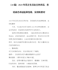 (18篇)2024年民主生活会主持讲话、总结表态讲话起草指南、实例和素材2024年民主生活会主持讲话、总结表态讲话起草指南、实例和素材 今天,与文友共同学习研究2024年对照检查材料,会议主持讲话、总结表态讲话的写作方法和技巧。 按照对照检查相关要求,一般由本单位的主要领导主持会议,讲话内容包括:会议流程介绍、各位同志在对照检查过程中的串联词,以及总结表态讲话等内容。其中,相对比较难写的是总结表态讲话,我们主要探讨这方面内容的写法。一、整体感知对于总结表态讲话,文友可能会有三个疑惑。疑惑一:总结表态讲话与整改措施有什么区别?整改措施,主要目的是为了解决问题。 因此,起草时要突出问题导向,...