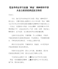 在全市传达学习全国“两会”精神领导干部大会上的总结讲话及主持词同志们:今天,我们召开全市传达学习全国“两会”精神领导干部大会上,主要任务是认真贯彻习2023年全国“两会”精神、习近平总书记在全国两会期间重要讲话精神和十四届全国人大一次会议、全国政协十四届一次会议精神,安排部署XX市市贯彻落实工作,切实动员全市上下进一步统一思想,坚定信心,聚焦重点,实干攻坚,全力推动经济社会高质量发展。出席今天会议的有:市委常委,市人大常委会、市政府、市政协领导班子成员和党组成员,市法院院长、市检察院检察长,市军区有关负责同志,XX级以上领导干部。参加今天会议的有:市直各机关、各县区、XX经济技术开发区职能部门...
