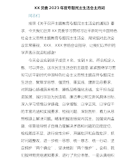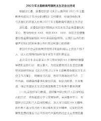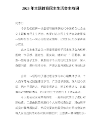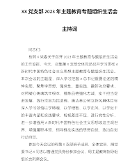 XX党支部学习贯彻习近平新时代中国特色社会主义思想主题教育专题组织生活会主持词同志们:按照X党委关于召开2023年主题教育专题组织生活会的工作安排,今天,召集第X支部全体党员召开学习贯彻习近平新时代中国特色社会主义思想主题教育专题组织生活会。本次会议的主题是,深入学习把握习近平总书记重要论述的精神实质,聚焦学思想、强党性、重实践、建新功总要求,对照凝心铸魂筑牢根本、锤炼品格强化忠诚、实干担当促进发展、践行宗旨为民造福、廉洁奉公树立新风具体目标,深入学习领悟以学铸魂、以学增智、以学正风、以学促干的丰富内涵和实践要求,检视差距不足,进行党性分析,进一步增强用习近平新时代中国特色社会主义思想改造主观...