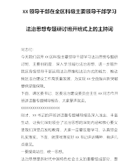 XX领导干部在全区科级主要领导干部学习法治思想专题研讨班开班式上的主持词同志们:今天我们召开XX区科级主要领导干部学习法治思想专题研讨班,主要目的是,深入学习践行法治思想,进一步提升我区各级领导干部运用法治思维和法治方式的能力,推动我区法治建设工作高质量发展,为实现XX全面振兴新突破提供坚强保障。下面,请区委书记、区委法治建设委员会主任XX同志作开班讲话暨专题辅导报告,大家掌声欢迎。XXXXXXXXXXXXXXXXXXXX刚才,XX书记的开班讲话暨专题辅导报告深入浅出、丰富生动,让我们深刻领会了法治思想的深刻内涵和核心要义使我们深受启发和教育,大家一定要反复学习、认真领会扎实落实。下面,就贯彻...