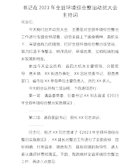 书记在2023年全县环境综合整治动员大会主持词同志们:今天我们召开动员大会,主要是对全县环境综合整治工作进行专题安排部署,动员全县上下振奋精神,真抓实干,采取强有力的措施,打好全县环境综合整治攻坚战,努力打造干净整洁、秩序良好、环境优美、文明和谐的城乡发展新局面。参加今天会议的有:县四大机关主要领导、分管领导,各乡镇、XX街道办事处、XX园区党委书记,县直各部门、省市驻XX亭各单位主要负责人,共约XX多人。今天的会议共有三项议程,下面逐项进行:第一项:请县委常委、纪委书记XX同志宣读《2023年全县环境综合整治实施意见》;…………第二项:请县委副书记、县长XX同志讲话;…………同志们,刚才XX...