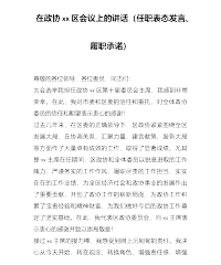 在政协xx区会议上的讲话(任职表态发言、履职承诺)尊敬的各位领导、各位委员、同志们:大会选举我担任政协xx区第十届委员会主席,我感到非常荣幸。在此,我对市委和区委的信任和重托,对全体政协委员的信任和期望表示衷心的感谢!过去几年来,在区委的正确领导下,区政协紧紧围绕全区发展大局,在协调关系、汇聚力量、建言献策、服务大局等方面作了大量卓有成效的工作,取得了显著成绩。尤其是xx主席在任期间,区政协和全体委员以锐意进取的工作魄力、严谨务实的工作作风,履职尽责的工作担当、实实在在的工作业绩,为全区经济社会和政协事业的发展作出了重要贡献,开创了政协工作的崭新局面,为政协工作积累了宝贵经验和精神财富,为我们...