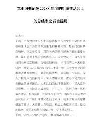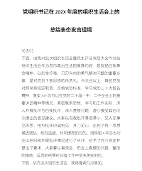 党组织书记在202XX年度的组织生活会上的总结表态发言提纲同志们:下面,由我对此次组织生活会暨民主评议党员大会作总结组织生活会作为党内政治生活的重要内容,是发扬自我革命精神,以刮骨疗毒、刀刃向内的勇气解决问题的重要步骤,是对党员干部思想的再洗礼。今天会议上,每名党员对照党章规定职责、合格党员标准、学习党的二十大报告精神、落实xxx总书记在党的二十届一中、二中全会上的重要讲话精神等情况,紧密联系思想、学习和工作实际,深入开展批评与自我批评,深入查摆问题,虚心接受其他同志提出的意见建议。大家以自我批评落细落小、见人见事见思想,相互批评坦诚相见、开门见山,达到了统一思想增进团结、相互监督、共同提高的...