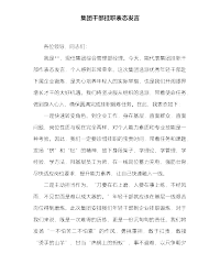 集团干部挂职表态发言 各位领导、同志们: 我是**,现任集团综合管理部经理。今天,能代表集团挂职干部作表态发言,个人感到非常荣幸。这次集团选派优秀年轻干部赴下属企业锻炼,是关心培养年轻人的实际举措,也是我们开阔眼界增长才干的大好机遇。我们将坚决服从组织的选派,带着使命任务,做到身入心入,确保圆满完成挂职锻炼任务。在此,我表态如下: 一是快速转变角色。到企业工作,身在基层,直面群众,直面问题,岗位性质与现在完全两样,对个人能力素质和专业技能是一种考验。因此,我们一定要珍惜挂职的宝贵时间,带着任务和课题,发扬“挤”和“钻”的精神,放下身段架子,学理论、学管理、学经验、学方法,拜基层员工为师,...