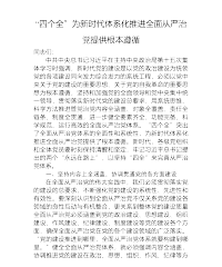“四个全”为新时代体系化推进全面从严治党提供根本遵循同志们:中共中央总书记习近平在主持中央政治局第十五次集体学习时强调,新时代党的建设是以党的政治建设为统领党的各项建设同向发力综合发力的系统工程,必须以党中央关于党的建设的重要思想、关于党的自我革命的重要思想为根本遵循,坚持和加强党的全面领导和党中央集中统一领导,贯彻落实新时代党的建设总要求,用系统思维、科学方法推进管党治党内容全涵盖、对象全覆盖、责任全链条、制度全贯通,进一步健全要素齐全、功能完备、科学规范、运行高效的全面从严治党体系。“四个全”突出了全面从严治党体系的全面性和系统性,为新时代体系化推进全面从严治党提供了根本遵循。新时代,各级...