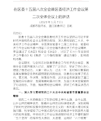 公文宝典(www.gongwenbaodian.com)收集整理,每天更新海量优质范文,让写材料变得简单!在区委十五届八次全会暨区委经济工作会议第二次全体会议上的讲话(2023年1月7日)成都市副市长、温江区委书记 王乾同志们:区委十五届八次全会暨区委经济工作会议坚持以习近平新时代中国特色社会主义思想为指导,深入贯彻党的二十大、中央经济工作会议精神,全面落实省委十二届二次全会、省委经济工作会议和市委十四届二次全会暨市委经济工作会议精神,审议通过了《决定》和全会《决议》,讨论了《2023年全区经济工作要点》和《推进“三个做优做强”建设方案》,即将胜利闭幕。会议期间,与会同志对区委常委会工作给予...
