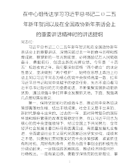 在中心组传达学习习近平总书记二Ο二五年新年贺词以及在全国政协新年茶话会上的重要讲话精神时的讲话提纲同志们:习近平总书记二〇二五年新年贺词和在全国政协新年茶话会上的重要讲话,深情回顾过去一年的奋斗历程和辉煌成就,展望新的一年光明前景,必将激励亿万人民砥砺奋斗、勇毅前行,创造出新的光辉业绩。今年是“十四五”规划收官之年。我们要深刻领悟“两个确立”的决定性意义,坚决做到“两个维护”,始终在思想上政治上行动上同以习近平同志为核心的党中央保持高度一致,扛牢习近平总书记和党中央赋予的使命任务,矢志不渝沿着习近平总书记指引的方向奋勇前进,不断集聚发展新动能新优势,通过顽强斗争打开事业发展新天地。下面,我强调...