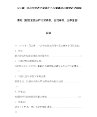 (21篇)学习中央政治局第十五次集体学习重要讲话精神素材(健全全面从严治党体系、自我革命、三中全会)目录一、2024年7月文章(中共中央政治局第十五次集体学习后发表)1.仲音:毫不动摇把党建设得更加坚强有力……………………………………………12.中国纪检监察报评论员:深刻领会习近平总书记重要讲话精神推动健全全面从严治党体系…………33.中国社会科学院大学柴宝勇:接受专访:以健全全面从严治党体系为有效途径……………………………64.仲祖文:加强新时代党的建设的重大举措……………………………………………105.仲祖文:健全上下贯通、执行有力的组织体系…………………………………………126.仲祖文:...
