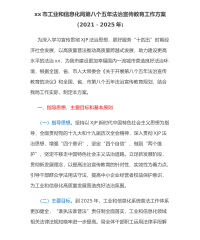 xx市工业和信息化局第八个五年法治宣传教育工作方案(2021-2025年)为深入学习宣传贯彻习近平法治思想,更好服务“十四五”时期经济社会发展,以高质量普法推动高质量跨越式发展,助力建设更高水平的法治xx,为我市建设更加幸福国内一流城市营造良好法治环境,根据全国、省、市人大常委会《关于开展第八个五年法治宣传教育的决议》和全国、省、市第八个五年法治宣传教育规划,结合我局工作实际,制定本方案。一、指导思想、主要目标和基本原则(一)指导思想。坚持以习近平新时代中国特色社会主义思想为指导,全面贯彻党的十九大和十九届历次全会精神,深入贯彻习近平法治思想,增强“四个意识”、坚定“四个自信”、做到“两个维护...
